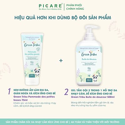 – Hiệu quả hơn khi dùng kèm với “Kem dưỡng ẩm, dịu ngứa da dị ứng/kích ứng da cho bé – Green Tribu Pommade des petites fesses 75ml”.