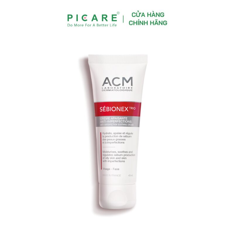 Kem dưỡng cho da mụn Sebionex Trio Anti-Imperfection Soothing Cream dùng trong giai đoạn viêm ngăn ngừa nhân mụn mới sản sinh, giúp làm dịu mát, giảm thâm do mụn. – Picare là nhà phân phối chính hãng của ACM tại Việt Nam.