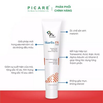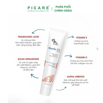 Fixderma Skarfix-TX là sản phẩm hỗ trợ làm sáng da, cải thiện sắc tố và làm mờ các vết thâm nám hiệu quả. Với công thức kết hợp Tranexamic Acid, Alpha Arbutin, Vitamin C và Kojic Acid, sản phẩm giúp giảm sản sinh melanin – nguyên nhân chính gây sạm da, thâm nám và tàn nhang – Picare là nhà phân phối chính hãng của Fixderma tại Việt Nam.