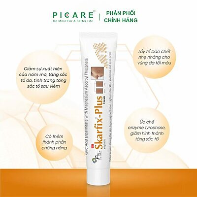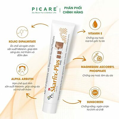 Fixderma Skarfix Plus là kem dưỡng da chuyên biệt hỗ trợ làm mờ thâm nám, cải thiện sắc tố da không đều màu. Với công thức kết hợp Kojic Acid Dipalmitate và dẫn xuất Vitamin C, sản phẩm giúp giảm sản sinh melanin, thúc đẩy tái tạo làn da đều màu, tươi sáng và khỏe mạnh – Picare là nhà phân phối chính hãng sản phẩm Fixderma tại Việt Nam.