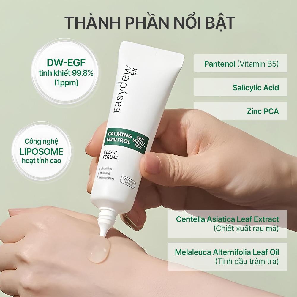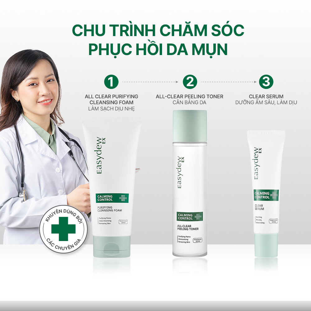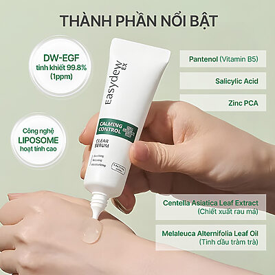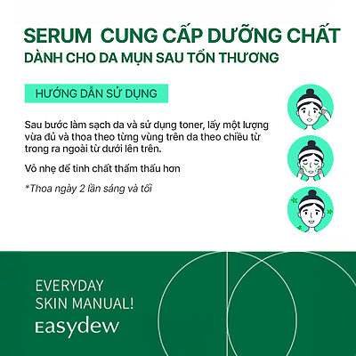 – Sau bước làm sạch da và sử dụng Easydew Ex Calming Control All – Clear Peeling Toner, lấy một lượng vừa đủ và thoa theo từng vùng trên da theo chiều từ trong ra ngoài từ dưới lên trên. Vỗ nhẹ để tinh chất thẩm thấu hơn.
